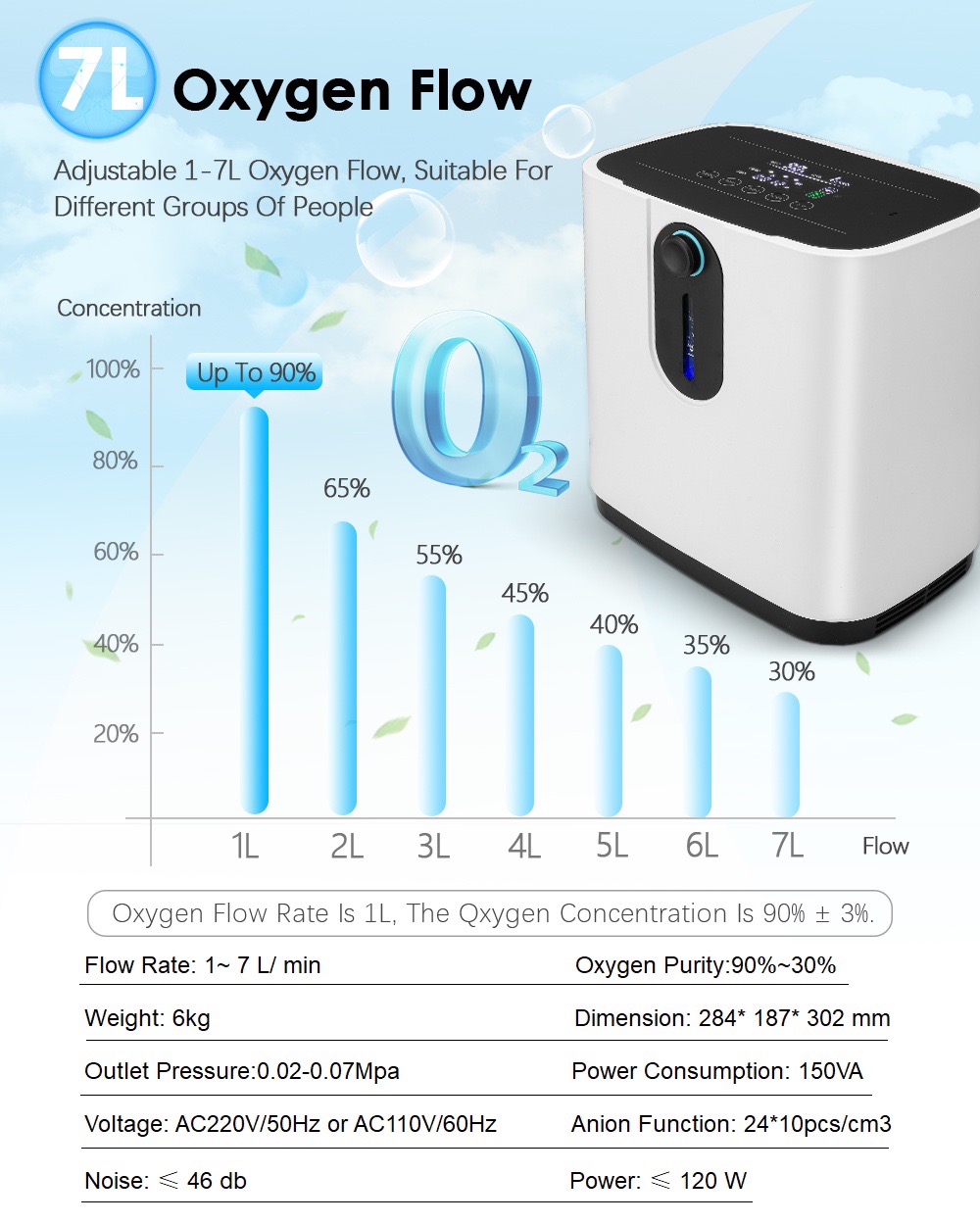 - Điều chỉnh được lưu lượng oxy: mức 1 lít nồng độ oxy >= 93%, mức 7 lít nồng độ oxy 40% ( vặn mức càng cao thì nồng độ oxy càng thấp).